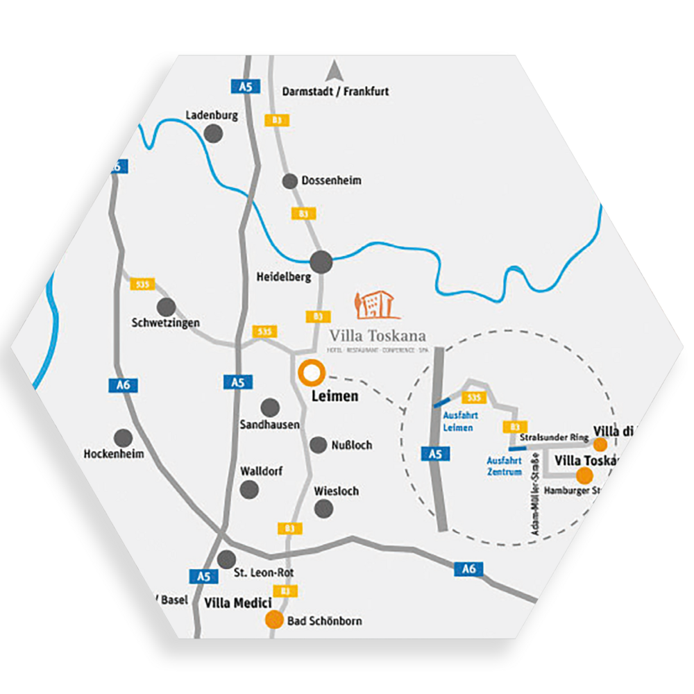 Von der A6 kommend, nehmen Sie die Ausfahrt 32-Wiesloch/Rauenberg und biegen rechts ab auf die L723. Nach ca. 2km biegen Sie links ab auf die B3 Richtung Heidelberg. Nach ca. 8km fahren Sie bei Leimen/Zentrum ab und nehmen im Kreisel die zweite Ausfahrt. Die erste Abbiegung nach rechts (Adam – Müller – Straße) und gleich die erste wieder links (Hamburger Straße).